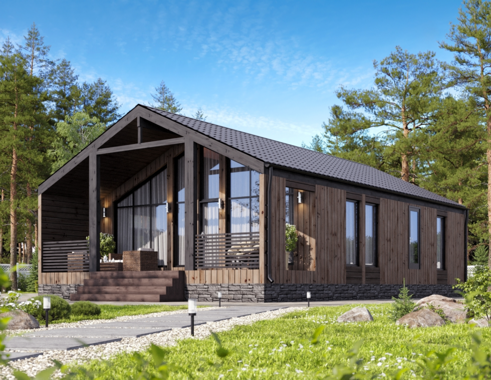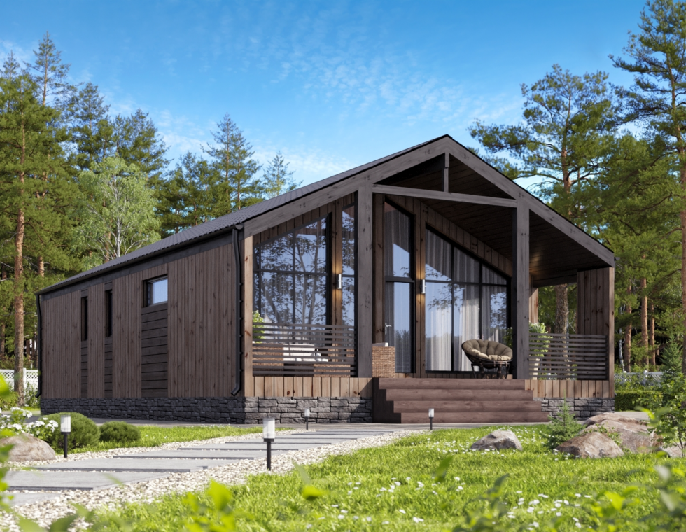 Стильный и уютный КД-1000 – это каркасный дом в стиле БарнХаус. Проекты домов в стиле BarnHouse удобны для жизни и идеально вписывается в окружающую среду. Это полноценный загородный дом и один из самых популярных проектов одноэтажных каркасных Барнов, с большой крытой террасой, предназначенный для круглогодичного комфортного проживания семьи из 3-4 человек.