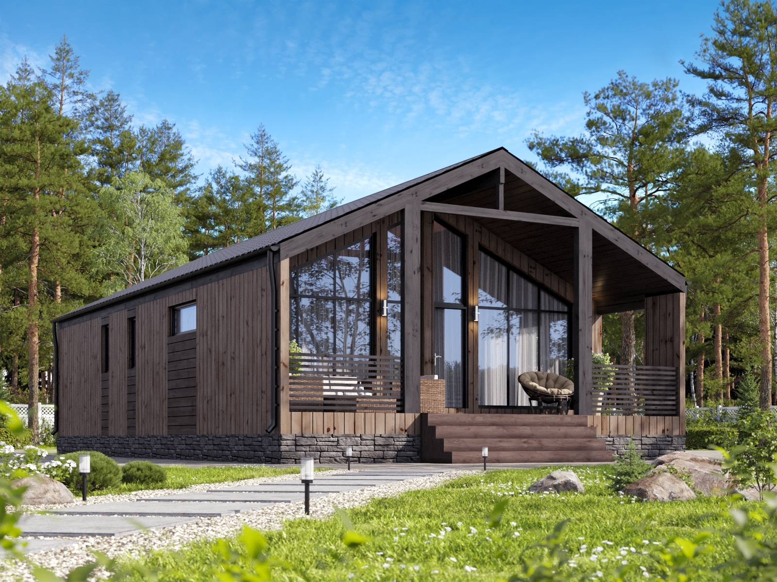 Стильный и уютный КД-1000 – это каркасный дом в стиле БарнХаус. Проекты домов в стиле BarnHouse удобны для жизни и идеально вписывается в окружающую среду. Это полноценный загородный дом и один из самых популярных проектов одноэтажных каркасных Барнов, с большой крытой террасой, предназначенный для круглогодичного комфортного проживания семьи из 3-4 человек.