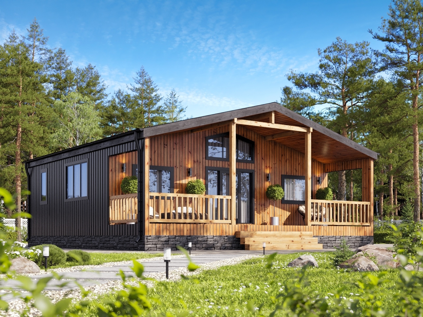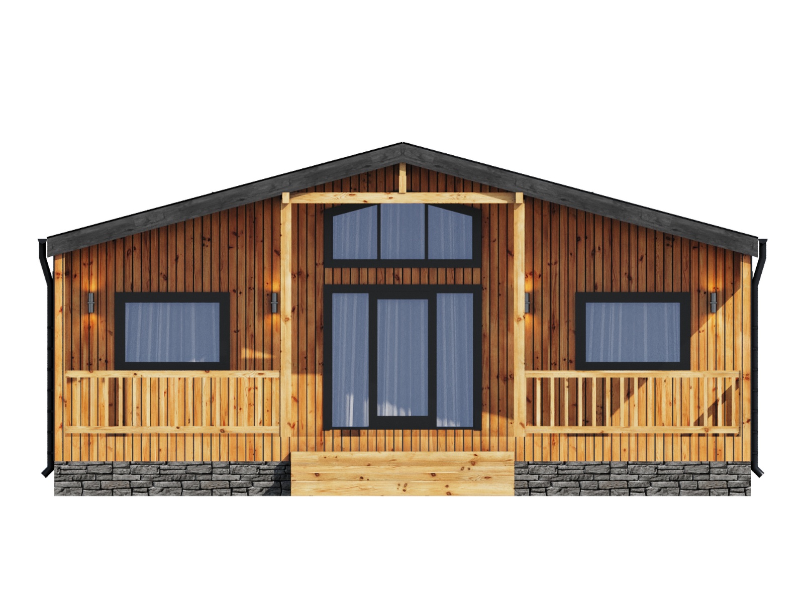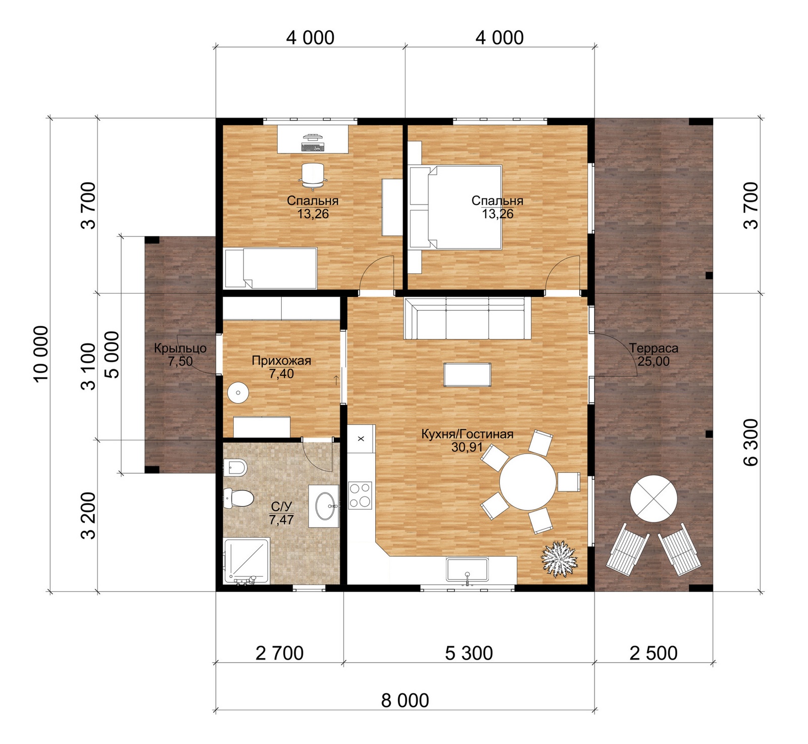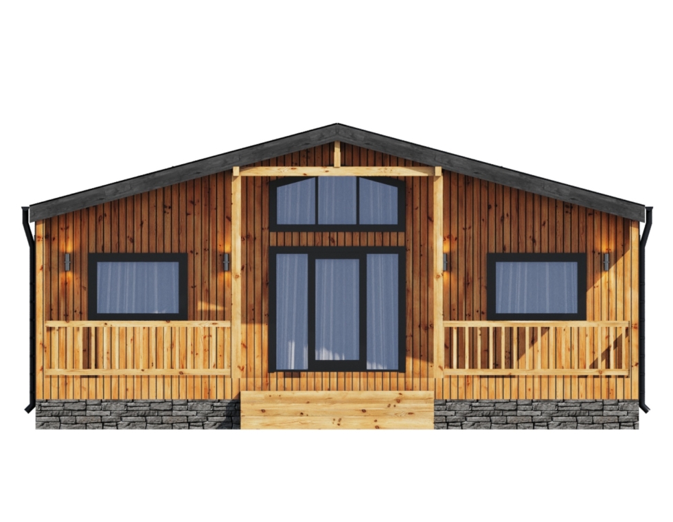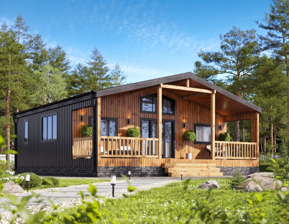 Дом имеет высокие потолки и оптимальные размеры. Планировкой предусмотрены две просторные спальни, большая крытая терраса, совмещенная кухня-гостиная, прихожая, крыльцо и санузел.