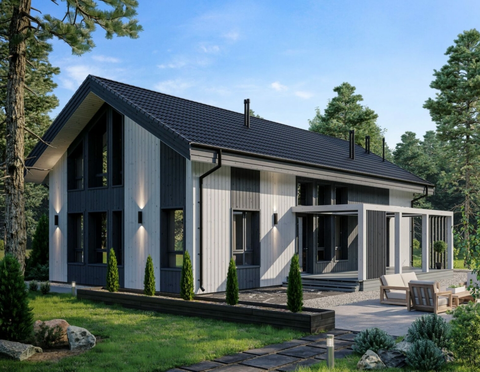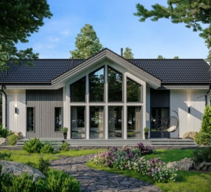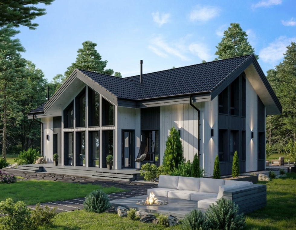 КД-1050 это красивый и удобный каркасный загородный дом для дружной семьи с современным экстерьерным решением и функциональной планировкой. Чёткие линии фасадов, контрастная отделка и обширное остекление. Внутри – две просторные спальни с гардеробами и санузлами, две стандартных спальни, сауна, большая кухня-гостиная.