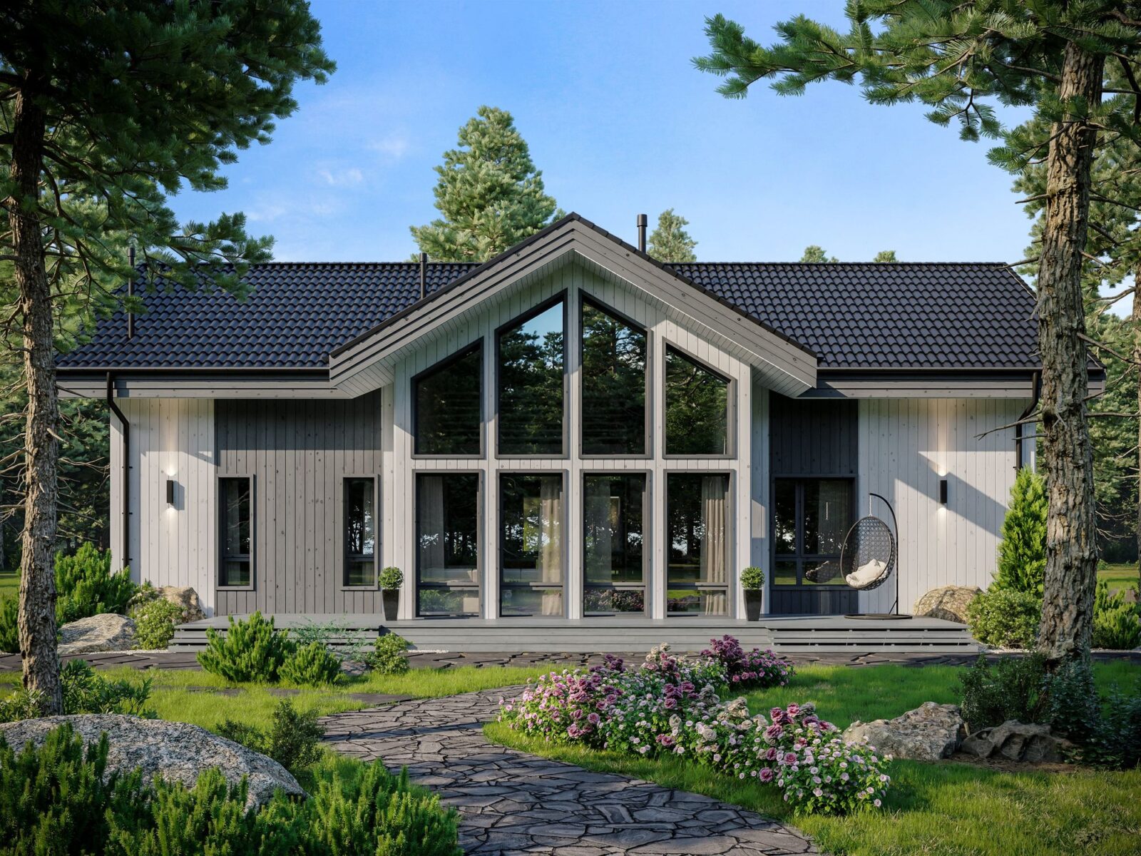 КД-1050 это красивый и удобный каркасный загородный дом для дружной семьи с современным экстерьерным решением и функциональной планировкой. Чёткие линии фасадов, контрастная отделка и обширное остекление. Внутри – две просторные спальни с гардеробами и санузлами, две стандартных спальни, сауна, большая кухня-гостиная.