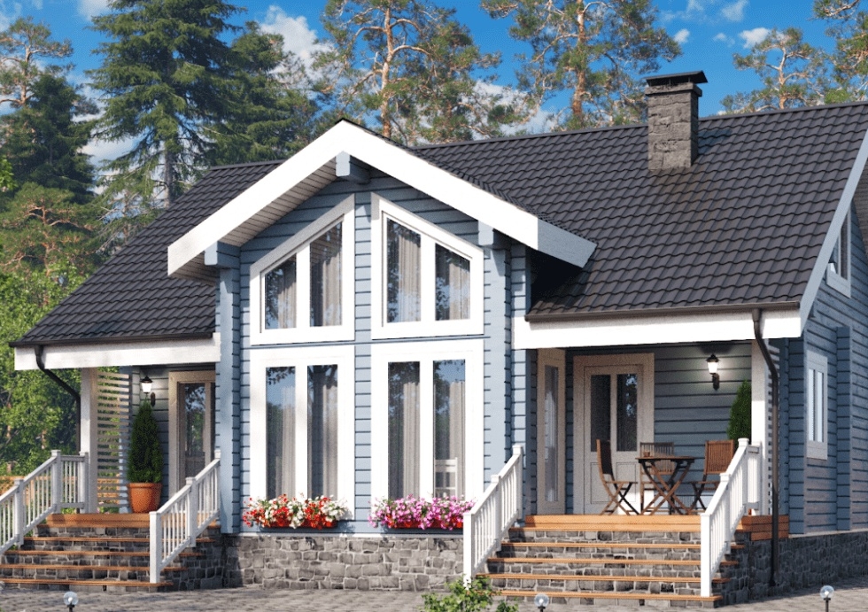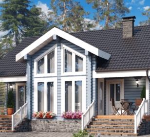 КД-230 — проект в традиционном стиле, который гармонично впишется в садовый участок любой площади. С любого из двух входов мы попадаем в просторную, светлую гостиную через панорамные окна которой можно любоваться окружающим видом.