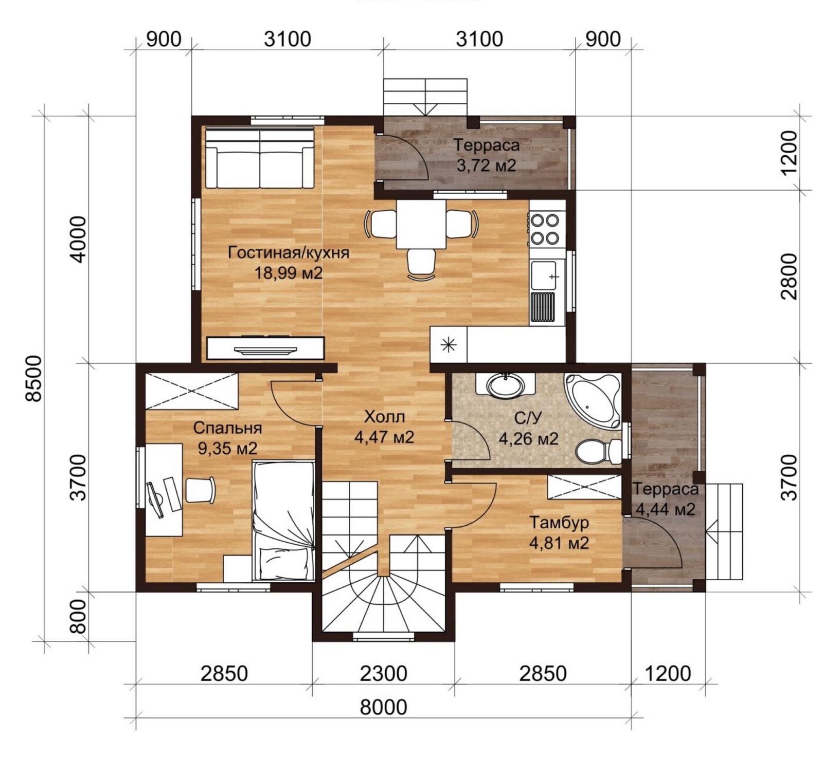 с двумя террасами, 100 м²