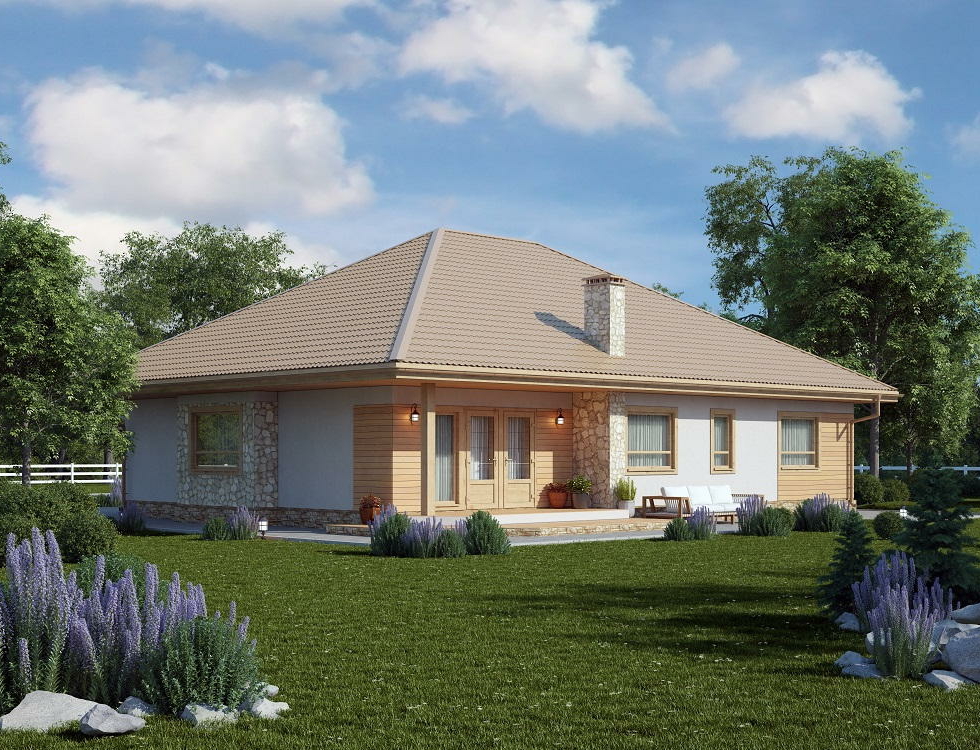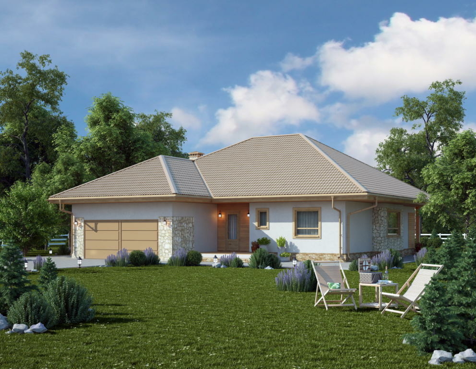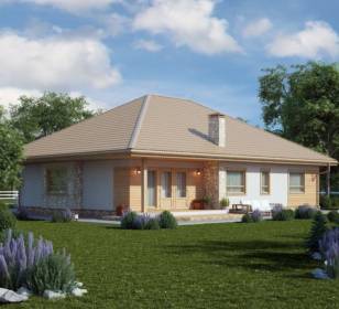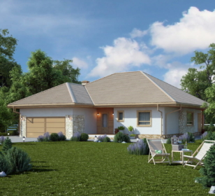 Просторный одноэтажный дом КД-310 подходит для большой семьи. В доме есть 3 шикарные спальни, 2 с/у, огромная гостиная с кухней и кладовой и подсобные помещения. Из прихожей мы попадем сразу в холл и оттуда в великолепную гостиную. В доме также есть теплый гараж на две машины.