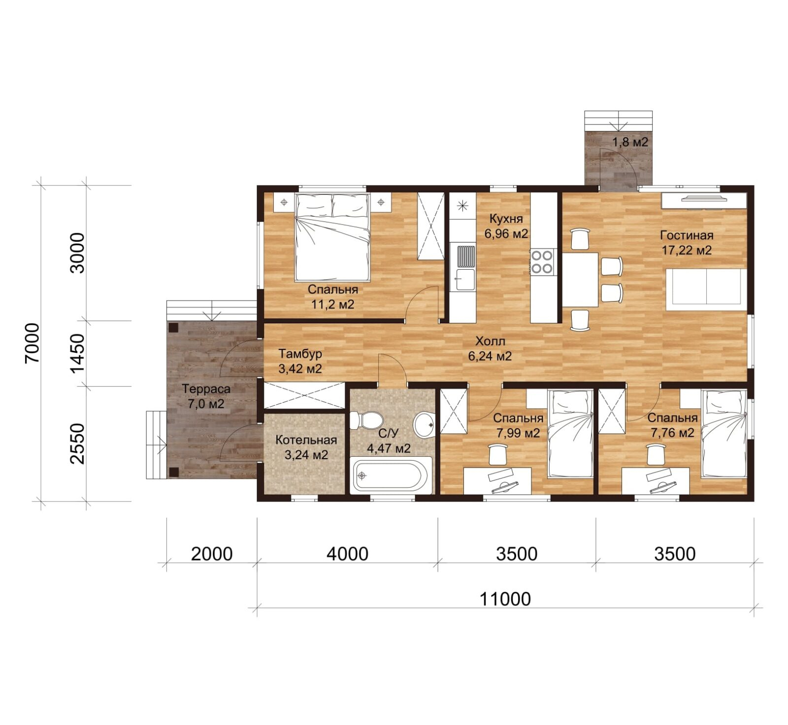 Одноэтажный каркасный дом с террасой, 77 м²