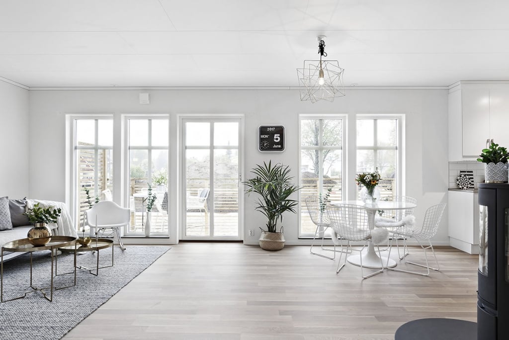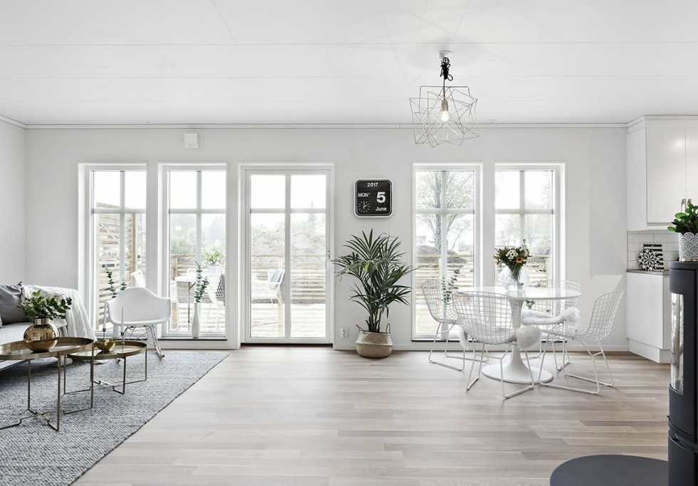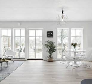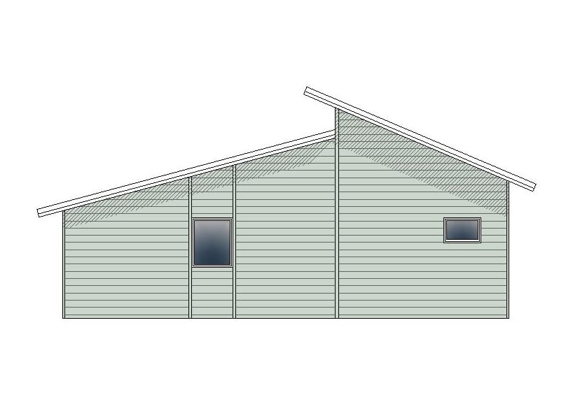 Благодаря грамотному планированию помещений дневная и ночная зоны не пересекаются и не создают дискомфорта. В одном крыле находится совмещенная кухня-гостиная площадью 34 м², из которой есть выход на террасу. Данное конструктивное решение обеспечивает просторное помещение достаточным количеством солнечного света для комфортной работы, творчества или отдыха В другом крыле — три комнаты для отдыха, санузел и тех. помещение.