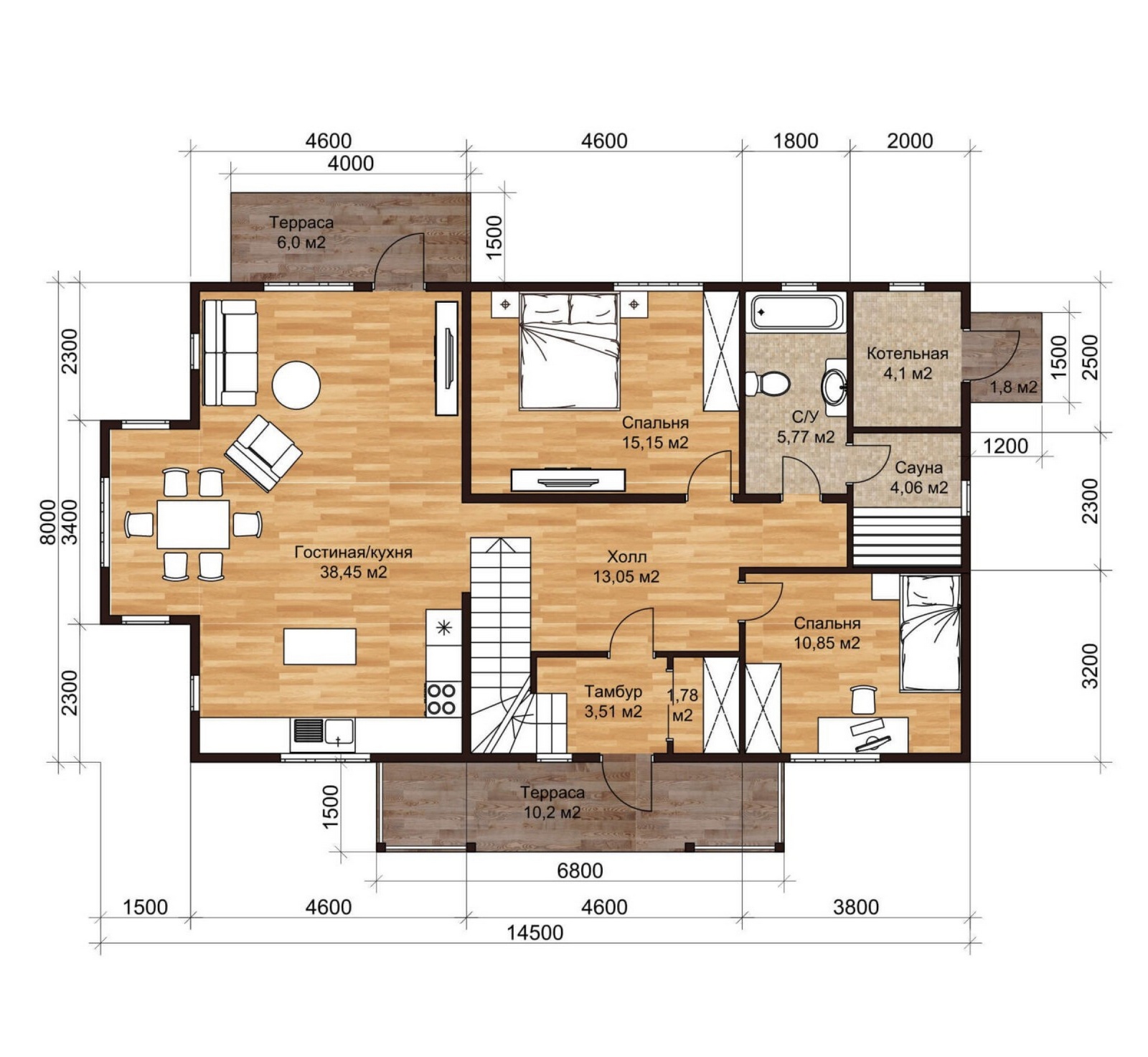 Двухэтажный каркасный дом с двумя террасами, 192 м²