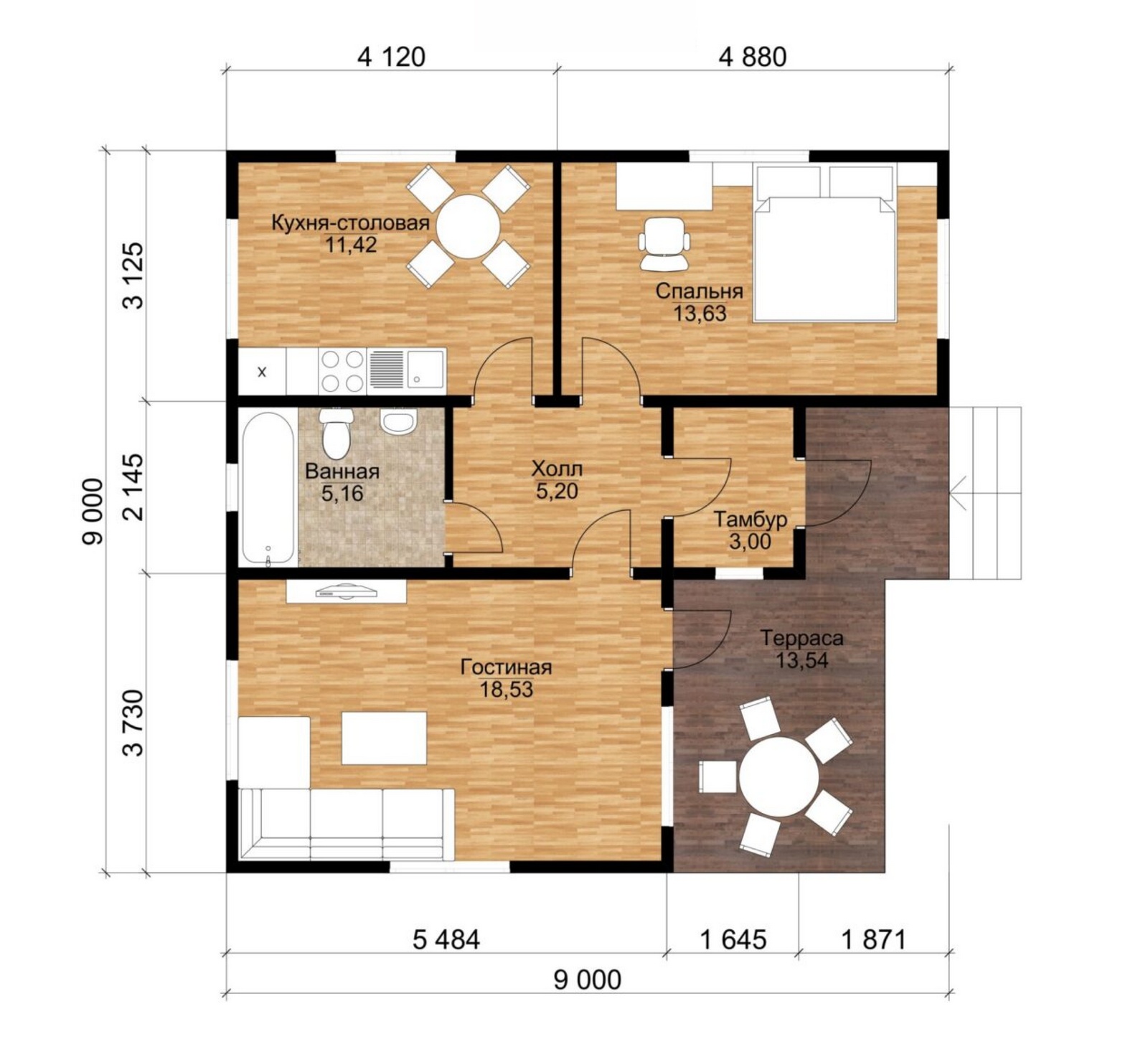КД-760 придется по вкусу тем, кто выбирает одноэтажные дома, ценит комфорт и отдает предпочтение продуманным стилистическим решениям. В доме есть большая гостиная, просторная кухня, уютная спальня, вместительный санузел, холл, а также красивая терраса, которая будет идеальным меcтом отдыха в теплое время года. Оптимальное количество окон позволяет наполнить все помещения достаточным количеством света. В вашем доме всегда будет комфортно, уютно и тепло.