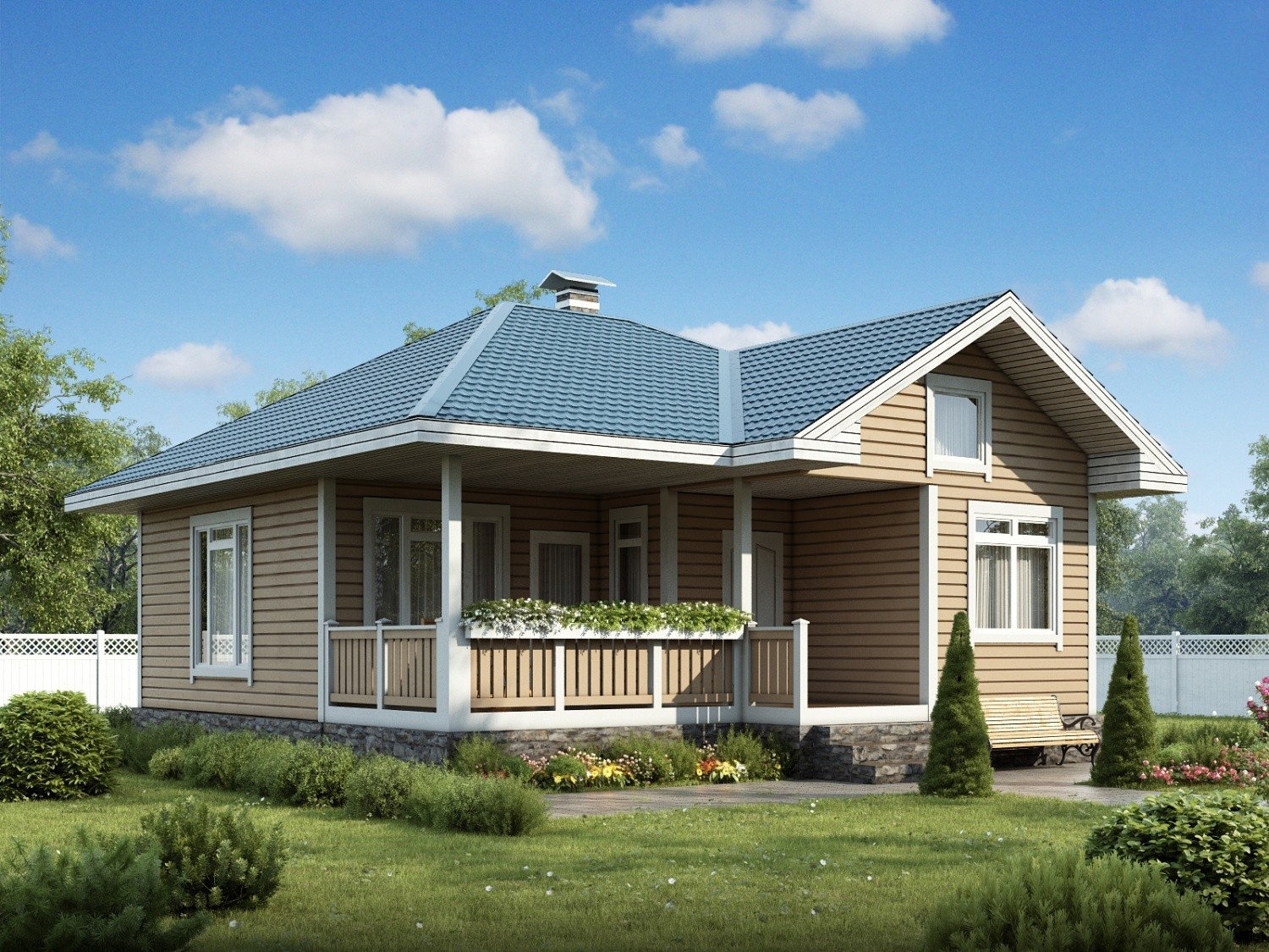 Одноэтажный каркасный дом с террасой и вторым светом, 78 м²