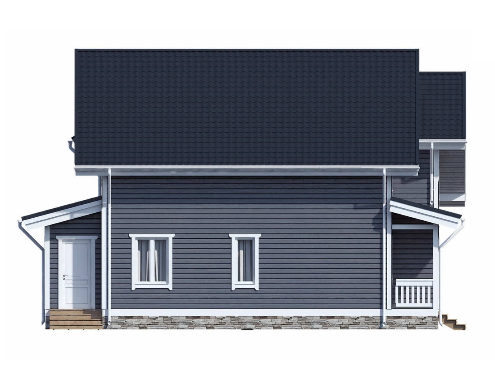 На первом этаже расположены: просторная спальня, санузел, технические помещения и сауна, а также большая кухня-гостиная панорамные окна которой наполняют ее светом. На втором этаже находятся три спальни, вместительный холл и санузел.