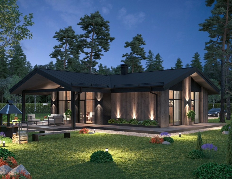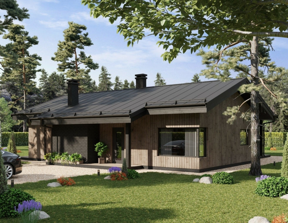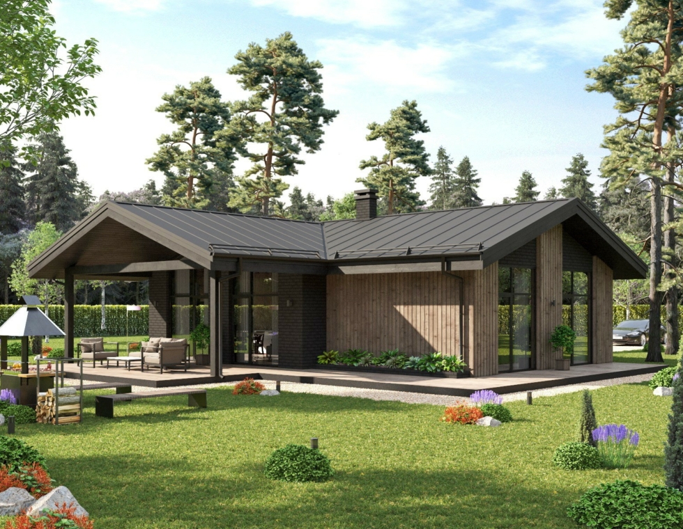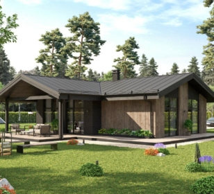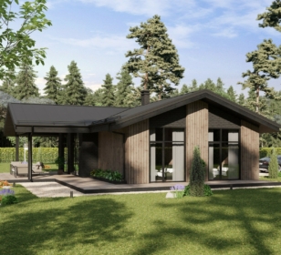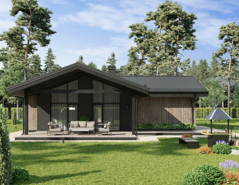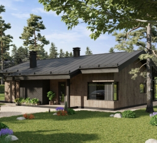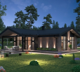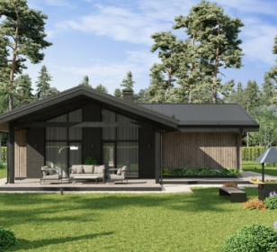 КД-930 – это одноэтажный дом с большой крытой террасой, высокими потолками в гостиной и тремя спальнями, который идеально подходит для жизни загородом. Внешний облик здания соответствует его основной функции – обеспечить благоустроенную жизнь отдельной семьи. КД-930 отличается великолепным внешним видом, удобством и чрезвычайно удачной планировкой.