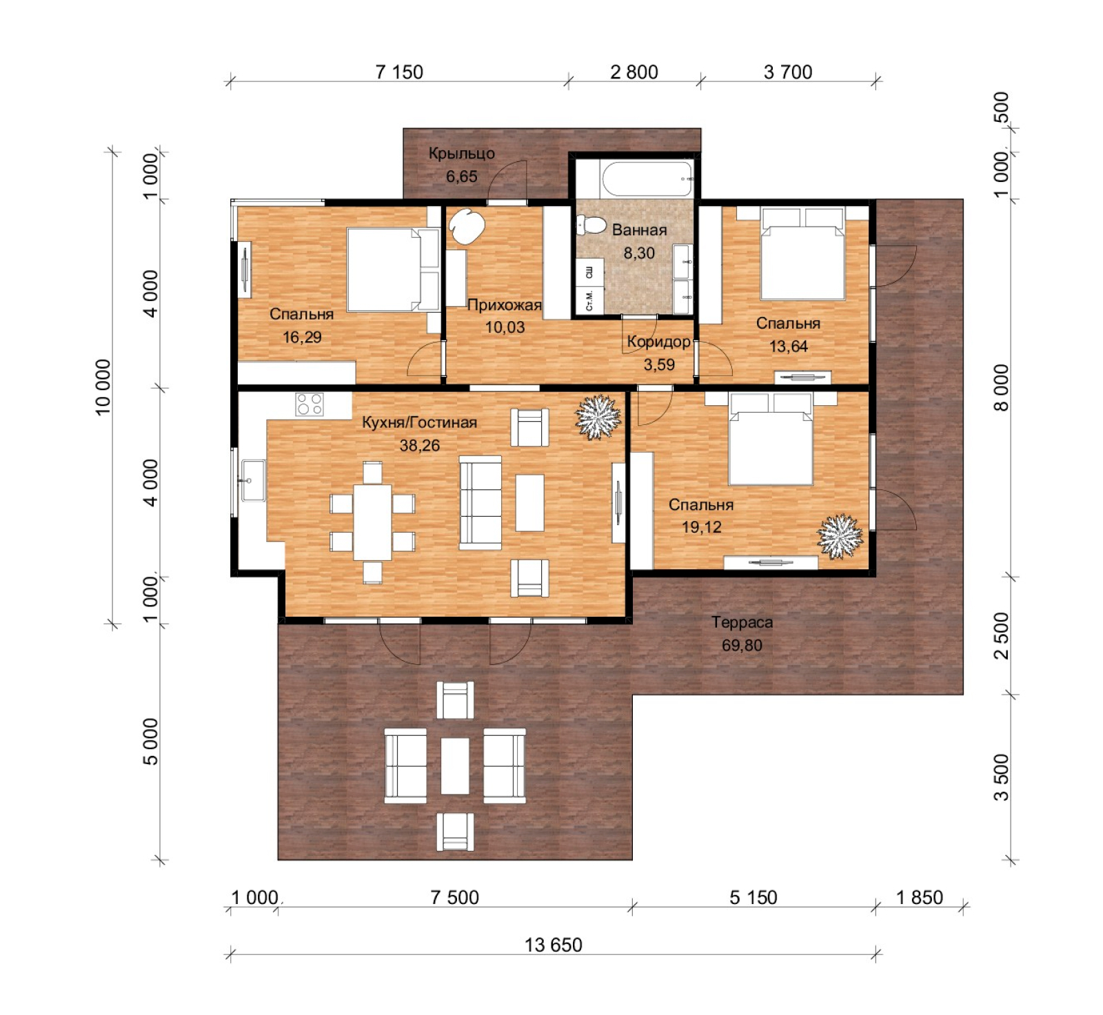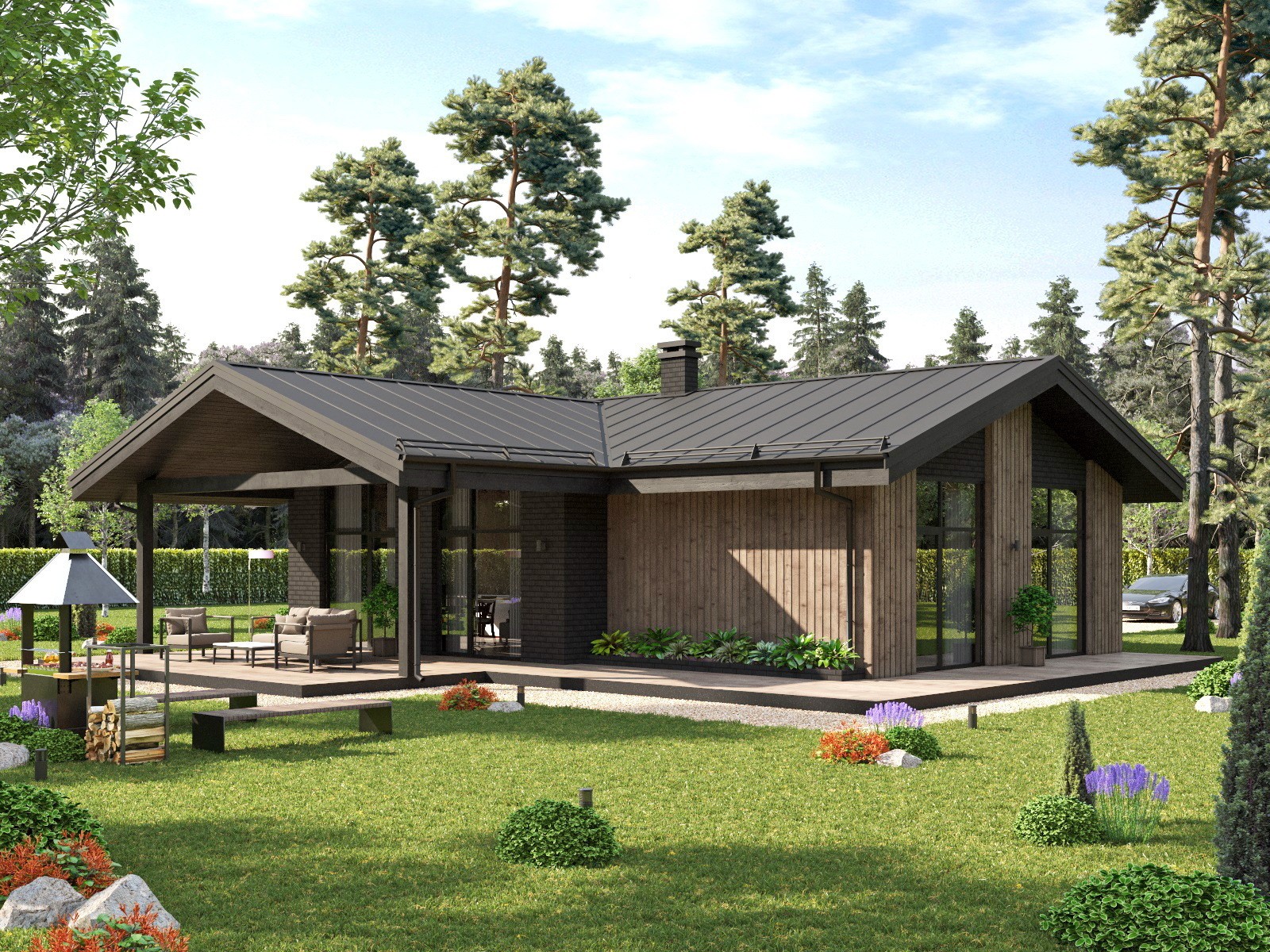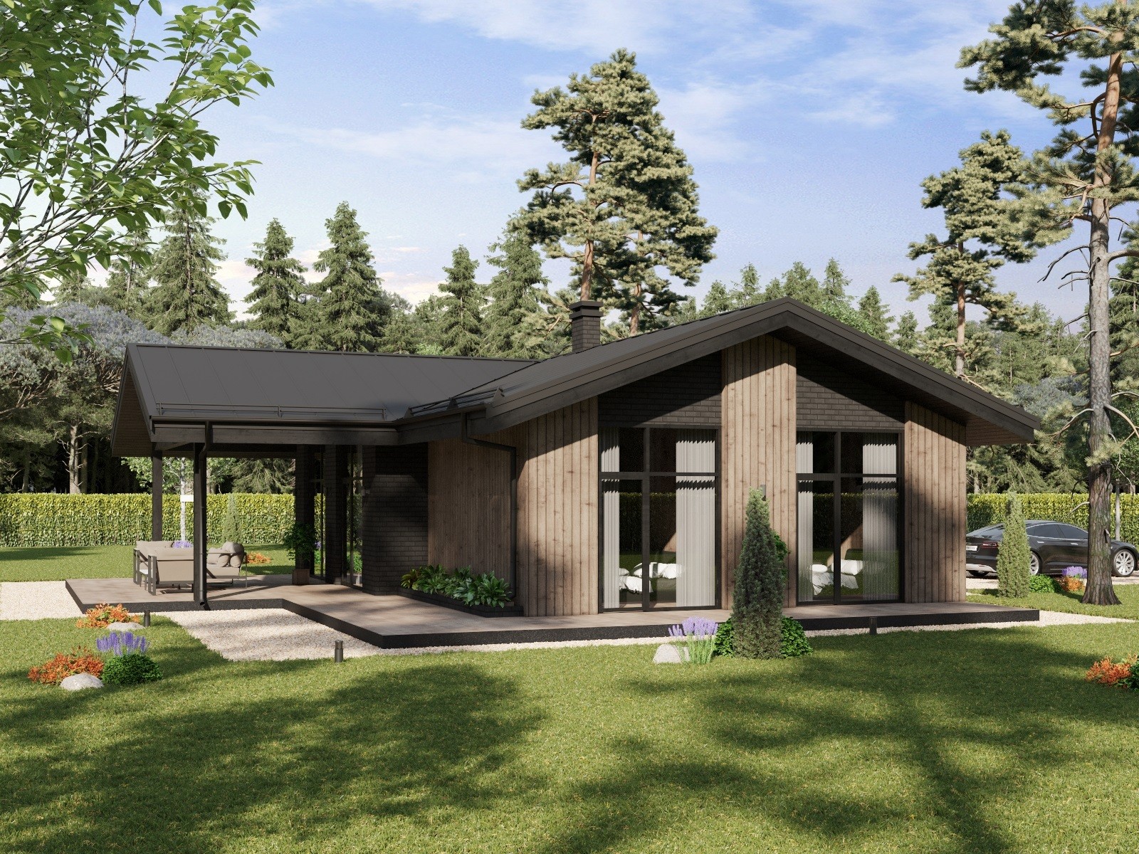 КД-930 – это одноэтажный дом с большой крытой террасой, высокими потолками в гостиной и тремя спальнями, который идеально подходит для жизни загородом. Внешний облик здания соответствует его основной функции – обеспечить благоустроенную жизнь отдельной семьи. КД-930 отличается великолепным внешним видом, удобством и чрезвычайно удачной планировкой.